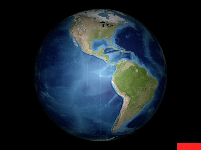 The (optional) -rws argument will draw water as a three-dimensional surface instead of applying it to the topography as a texture, as is the default setting. This will create a better representation of water flow when seen from oblique angles. After these changes, the AR Sandbox will show a navigable three-dimensional view of the 3D topography model, including water drawn as a real 3D surface, on the secondary display. The secondary display can be rotated, translated, and scaled as in many other 3D graphics software, using a combination of mouse buttons and keyboard keys. Most importantly, pressing the left mouse button will rotate the view around the center of the window, and pressing the "Z" key while moving the mouse will translate the view in the window's plane. Pressing the left mouse button and "Z" key together, while moving the mouse up and down, will scale the view (zoom in or out), as will rolling the mouse wheel. Finally, pressing the left mouse button, the "Z" key, and the left Shift key, while moving the mouse up or down, will "dolly" the view in or out of the window's plane, as will rolling the mouse wheel while pressing the left Shift key.